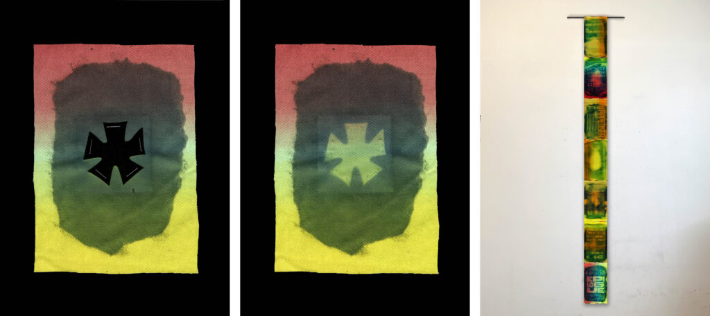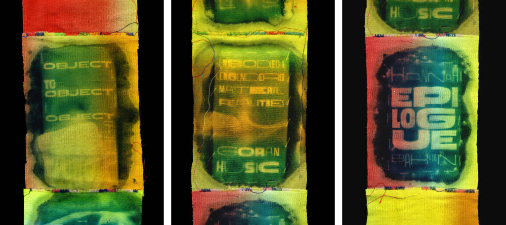 The chemicals of the cyanotype process automatically make the final print blue. However, by using a multi-colored fabric as a printing surface, I was able to add more colors. The final print is the actual size of the project presented on the web, bringing the very digital ratio of 1920×1080 px into the physical world and then transporting it back again.
