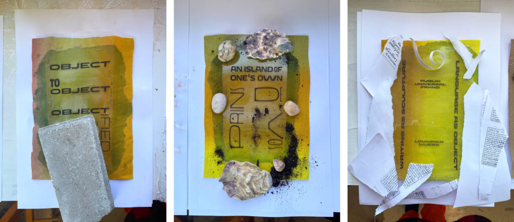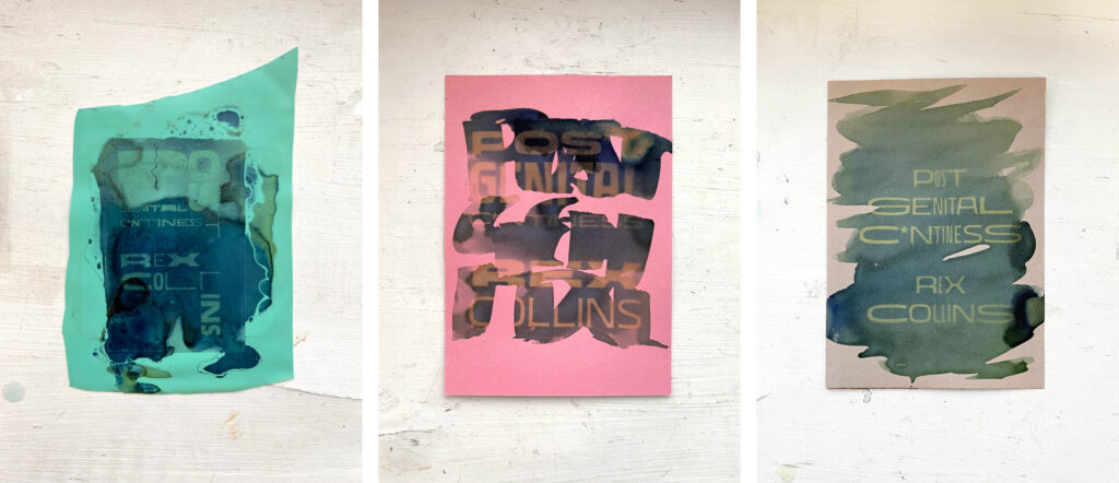 Instead, I decided to use the physical objects as part of the exposure. By covering areas with the objects and making these parts unexposed to the sun, I created shadows of the objects on the print. Portions of text are printed with black ink on plastic sheets, leaving the typographic parts of the finished prints unexposed. Titles of artworks and artists are set in the typeface Puffling by Ro Hernández, which is described as “our little queer utopia, a diverse family of weirdos ready to tell all those stories that don’t quite fit the common types”. Puffling comes in many weights and is born out of the crafty hands of linocut.
