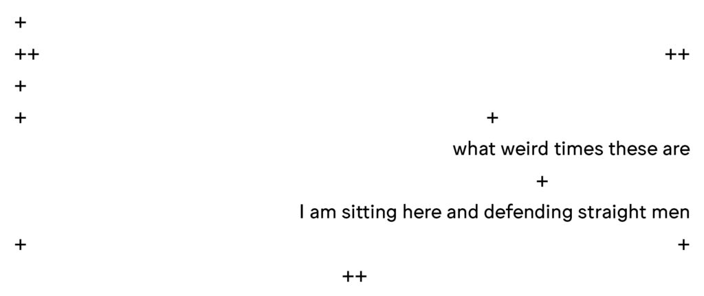 Genderqueer is a 90’s bitch. Non-binary is y2k. Both + championed by trans(sexual) writers refuting and transgressing gender. However, once fluidity is articulated + and discursively ++ constructed, it can be + inhabited by people making it perhaps no longer a non-category. Hence, there is merit to this exercise.       +